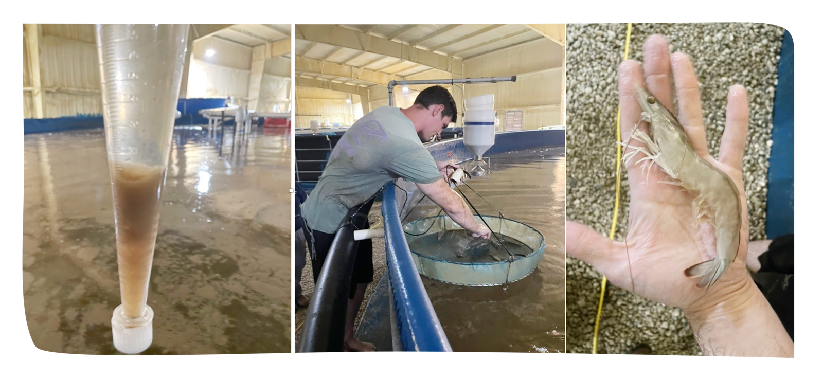 In ponds with circular water flow, solids often deposit near the center without going out the drain (left). In earthen ponds, this can require excavating the deposits between cycles (center). Shrimp toilets, if designed properly, can help transport solids to the center drain (right). (Pat et al., 2022, Aquaculture Engineering).