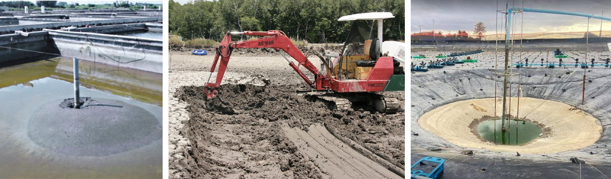 To reduce the negative effects of solid waste, horizontal currents from paddlewheel aerators and other circulation devices are used to sweep solids toward a center drain for discharge. As radial currents approach the center of the pond, their horizontal velocity decreases, causing solids to begin dropping out of suspension before reaching the center drain. Some ponds are equipped with siphons to remove solids that accumulate around the center of the pond, but manual siphons are inefficient and time consuming, given the depth, poor visibility, large area, and cleaning requirements. Mechanical cleaning devices are not yet market-ready.